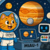 Rakieta „Miau-1” spokojnie sunęła przez kosmos, pozostawiając za sobą Jowisza i jego niezwykłe księżyce. Astro kotek, zwinięty wygodnie na fotelu pilota, drzemał spokojnie, tuląc pluszowego szczurka. Zippy, robotyczny przyjaciel Astro, właśnie analizował kolejne fascynujące dane na pokładowym ekranie.