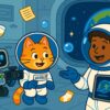 Rakieta „Miau-1” spokojnie dryfowała pośród gwiazd, leniwie kołysząc się w kosmicznej pustce. Astro kotek wygodnie rozłożył się na swoim ulubionym fotelu pilota, przytulając miękkiego pluszowego szczurka i leniwie mrucząc. Jego robotyczny przyjaciel Zippy w skupieniu analizował różne kosmiczne sygnały, wyświetlające się na pokładowym ekranie.